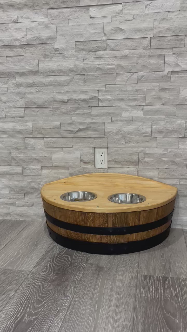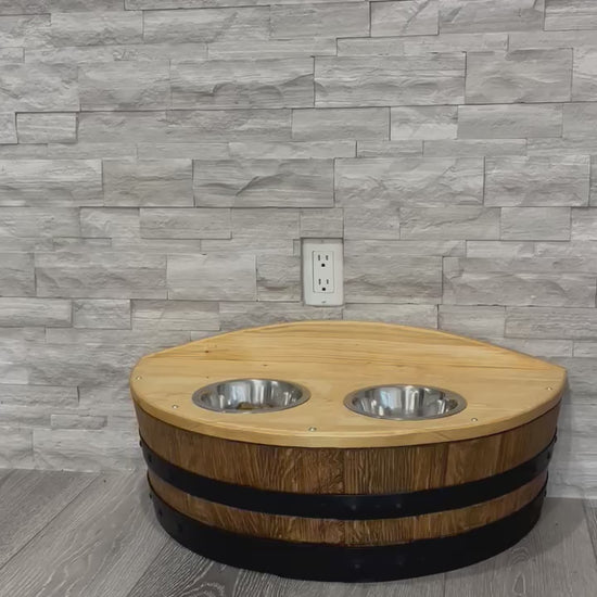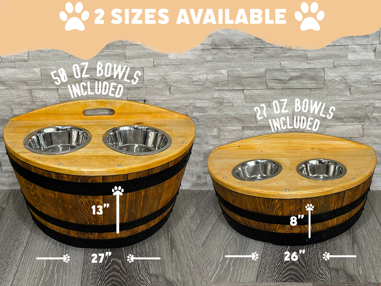 Hand-Made Authentic Pet Dog Cat Feeder Barrel, Handcrafted from Real Wine Whiskey Bourbon Barrel includes pet bowls, optional name engraving
