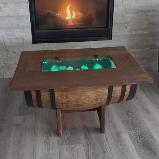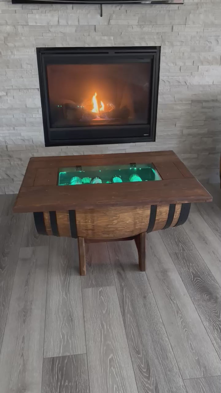 Whiskey Barrel Coffee Table Removable GlassTop ,Handmade Authentic from Real Wine Bourbon Barrel include LED Lights ,Liquor Storage