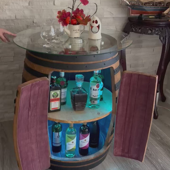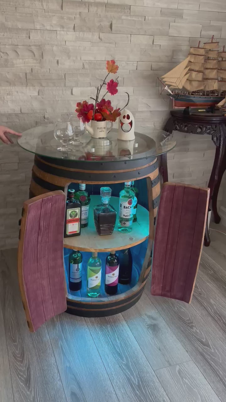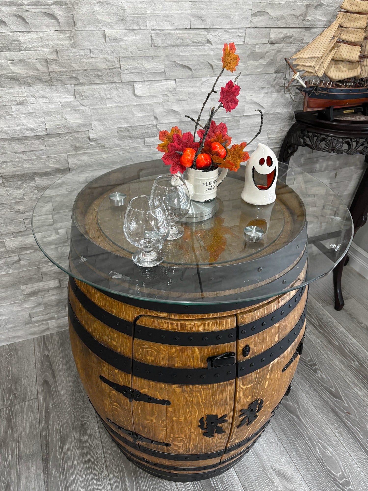 Elevate your home bar experience with this stunning Liquor Cabinet Barrel Bar Table. Crafted from a genuine barrel, it boasts a rustic charm that adds character to any space. The rotating glass top not only showcases your favorite spirits but also features integrated LED lights, creating an inviting ambiance for gatherings. With ample storage for bottles and glassware, this versatile piece combines style and functionality, making it a perfect centerpiece for entertaining. Whether you're hosting friends or enjoying a quiet evening, this barrel table is sure to impress.