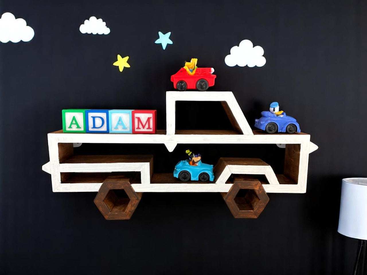 Bring charm, creativity, and personalized flair to your child's space with our Handmade Wooden Truck Shelf — a unique blend of toy storage and playful decor. Designed in the shape of a classic truck, this shelf can be easily mounted on the wall or used freestanding, making it a perfect fit for any room layout.