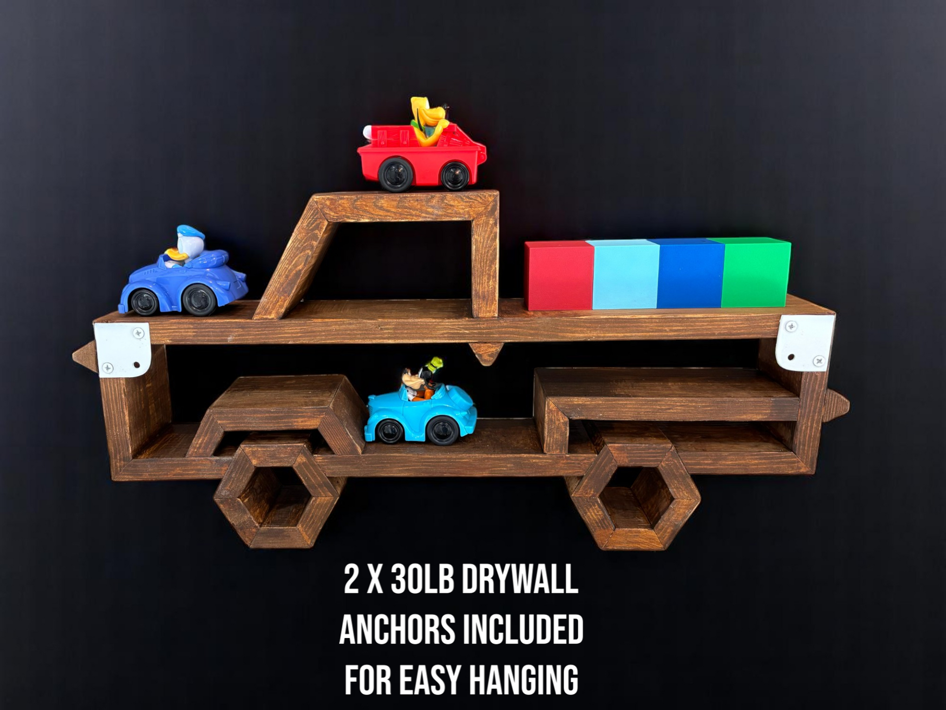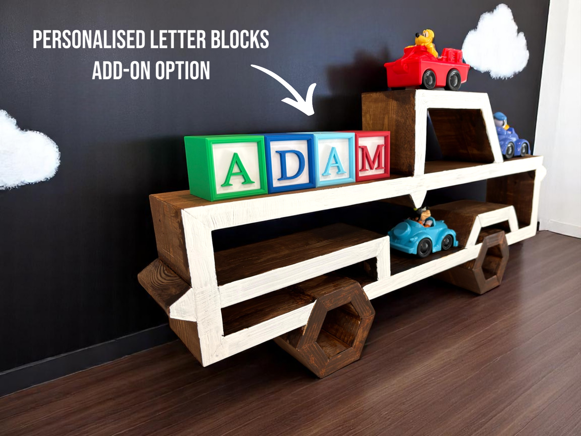 Handmade Wooden Truck Shelf – Wall-Mountable or Freestanding Toy Car Storage with Optional Name Blocks